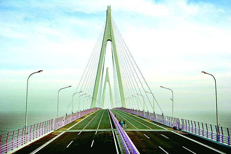 圖為杭州灣跨海大橋北航道橋雙塔雄姿。 (胡建華 許 蘋 攝)
