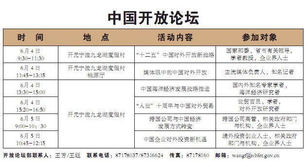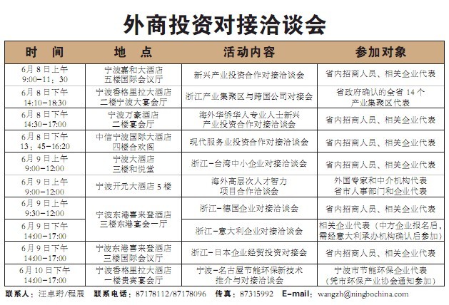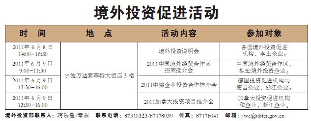 2011年6月8日至11日,第十三屆中國浙江投資貿(mào)易洽談會、第十屆中國國際日用消費品博覽會將在寧波舉行。以“發(fā)展海洋經(jīng)濟、擴大產(chǎn)業(yè)合作、提升開放水平”為主題,本屆浙洽會、消博會為全面推進我省海洋經(jīng)濟強省建設(shè),促進開放型經(jīng)濟轉(zhuǎn)型升級,提升我省對外開放水平,推出了一系列產(chǎn)業(yè)對接、貿(mào)易洽談、主題論壇等公共服務(wù)產(chǎn)品。國內(nèi)外客商介紹和經(jīng)貿(mào)合作意向詳見浙洽會網(wǎng)站(www.zjits.com)和消博會網(wǎng)站(www.cicgf.com)。