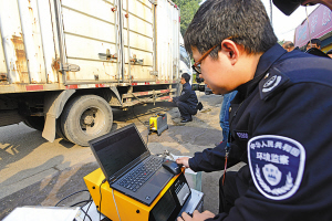 | 昨天上午,執(zhí)法人員正在對(duì)一輛疑似超標(biāo)卡車進(jìn)行尾氣檢測(cè)。 (記者 徐能 攝) |