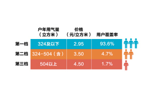 居民階梯氣價制度以戶為單位(對應(yīng)的家庭戶籍人口為4人),以年度為計量周期,確定三檔氣量和對應(yīng)的價格,各檔價格按用氣量實行超額累進加價。第一檔、第二檔、第三檔年用氣量分別為324立方米及以下、324立方米至504立方米(含)、504立方米以上,對應(yīng)的價格分別為每立方米2.95元、3.5元和4.5元。按2014年寧波市區(qū)居民用戶實際用氣量數(shù)據(jù)測算,各檔氣量用戶覆蓋率分別達到93.6%、4.7%及1.7%。階梯氣價方案按照“;尽⒋俟(jié)約”的原則確定。各檔氣價比價關(guān)系基本保持在國家發(fā)展改革委指導(dǎo)意見要求的1:1.2:1.5水平。