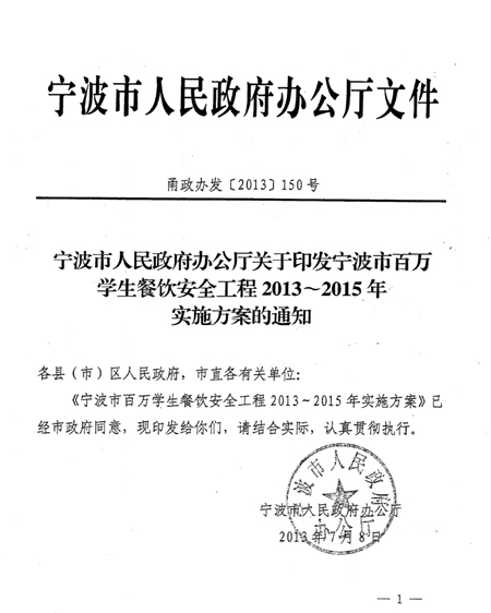 寧波市人民政府辦公廳關(guān)于印發(fā)寧波市百萬學生餐飲安全工程2013--2015年實施方案的通知
