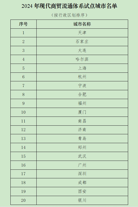 寧波、天津等20個(gè)城市擬納入2024年現(xiàn)代商貿(mào)流通體系試點(diǎn)范圍,將成為首批試點(diǎn)城市。公示期將持續(xù)至6月6日。