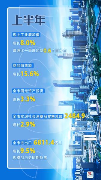上半年,全市規(guī)模以上工業(yè)增加值同比增長8.0%,比一季度加快0.6個百分點。