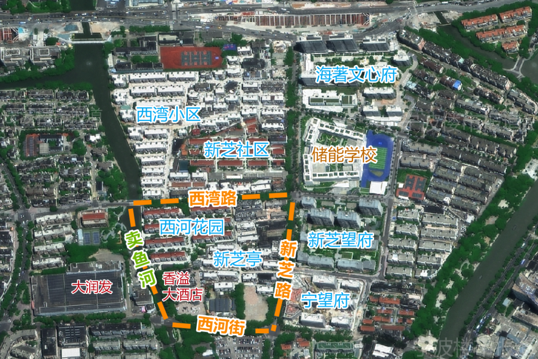 這片區(qū)域,在海曙新芝那里、原海曙歐尚(現(xiàn)大潤發(fā))的東側(cè),主要包括香溢大酒店、西河花園、新芝亭小區(qū)及其南側(cè)的一處空地。具體范圍,東至新芝路、南至西河街、西至賣魚河、北至西灣路,面積約為6.1公頃。