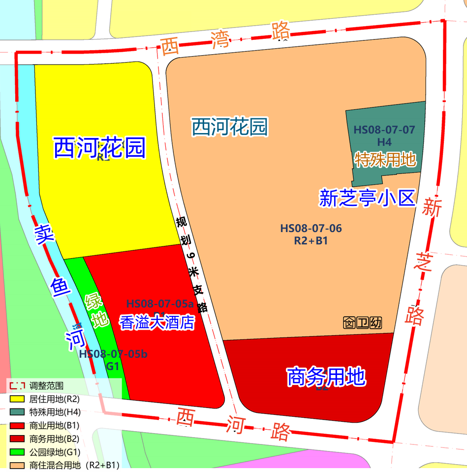 該商務(wù)用地北面、西河花園部分和新芝亭小區(qū)所在的大地塊,性質(zhì)變?yōu)樯套』旌嫌玫,?2班幼兒園、社區(qū)衛(wèi)生服務(wù)站、文體活動站各1處,另有一塊東臨新芝路的特殊用地;