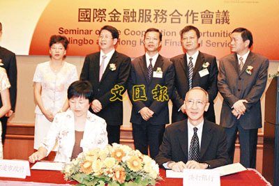 【本報(bào)訊】(記者卓建安、茅建興)“2007甬港經(jīng)濟(jì)合作論壇”重頭活動(dòng)之一國(guó)際金融服務(wù)合作會(huì)議昨日在港舉辦,寧波市副市長(zhǎng)蘇利冕、中國(guó)人民銀行寧波市中心支行行長(zhǎng)殷興山、匯豐銀行亞太區(qū)業(yè)務(wù)策略及經(jīng)濟(jì)顧問(wèn)梁兆基等分別在會(huì)上介紹了寧波市經(jīng)濟(jì)發(fā)展情況、寧波市金融業(yè)的情況和香港金融業(yè)的發(fā)展概況,寧波市并與海外金融機(jī)構(gòu)簽訂了多項(xiàng)合作協(xié)議。