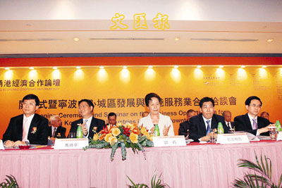 “2007甬港經(jīng)濟(jì)合作論壇”由寧波市政府和香港貿(mào)發(fā)局聯(lián)合舉辦,香港《文匯報》作為該論壇的支持單位,浙江省委常委、寧波市委書記巴音朝魯和市長毛光烈專程來港出席了開幕式。