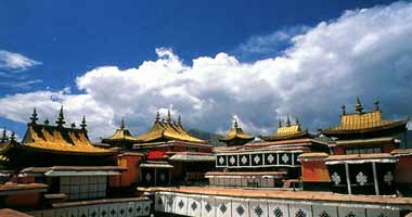 第一部分主要集中在白宮。白宮始建于1645年,歷時(shí)8年,以松贊干布時(shí)原有的觀音堂為中心,向東向西修建起一片巨大的寺宇。整個(gè)寺宇的墻面被涂成白色,遠(yuǎn)遠(yuǎn)望去,分外醒目,人們稱之為“白宮”。白宮高7層,位于第4層中央的“措欽夏”(東大殿)面積717平方米,由38根大柱支撐,是布達(dá)拉宮最大的殿堂,歷代達(dá)賴?yán)镌诖伺e行坐床、親政大典等重大宗教和政治活動(dòng)。第5、6兩層是攝政辦公和生活用房。最高的一層(第7層)是達(dá)賴?yán)锒瑢m,這里采光面積很大,從早到晚,陽光燦爛,俗稱“日光殿”。殿內(nèi)陳設(shè)豪華、金盆玉碗,珠光寶氣,顯示出主人高貴的地位。宮殿外,有一個(gè)寬大的陽臺,從這里可以俯視整個(gè)拉薩城。遠(yuǎn)處是起伏連綿的群山,美麗的拉薩河宛如一條緞帶,從天邊飄來。近處是片片田隴阡陌,綠樹村舍,還有古老的大昭寺金碧輝煌的金頂。