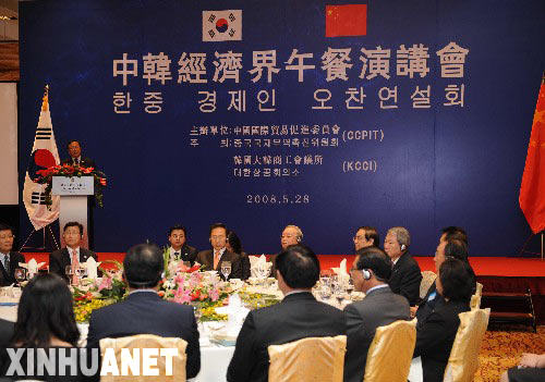5月28日,來(lái)華訪問(wèn)的韓國(guó)總統(tǒng)李明博出席中韓經(jīng)濟(jì)界午餐演講會(huì)。 新華社記者高潔攝