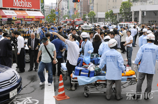 圖片說明:2008年6月8日,日本東京秋葉原,救援人員趕到持刀殺人事故現(xiàn)場(chǎng)。