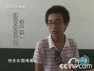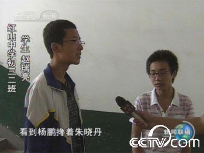 紅山中學初三二班學生張博:看到楊鵬攙著朱曉丹往下走著呢,也比較吃力一點。我在左面攙著,他(趙瑞亮)在右面攙著。