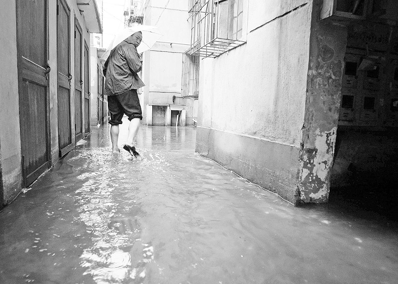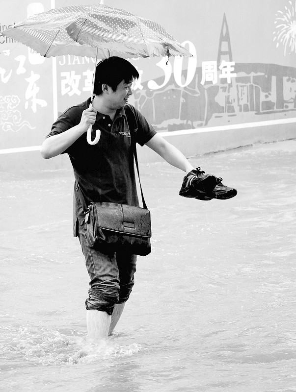 積水太深,市民脫掉鞋子過馬路。 記者 王增芳 攝