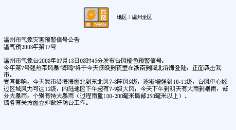 浙江在線07月18日訊記者從溫州市氣象臺(tái)了解到,溫州氣象臺(tái)于今天上午8時(shí)45分發(fā)布臺(tái)風(fēng)橙色預(yù)警信號(hào)。 據(jù)悉,今年第7號(hào)強(qiáng)熱帶風(fēng)暴“海鷗”,今天07時(shí)中心位置位于臺(tái)灣省臺(tái)北附近,距離溫州大約330公里,就是在北緯25.1度,東經(jīng)121.2度,近中心最大風(fēng)力10級(jí)(25m/s),七級(jí)風(fēng)圈半徑250公里,10級(jí)風(fēng)圈半徑40公里,F(xiàn)在中心正以每小時(shí)15~20公里的速度,朝西北偏北方向移動(dòng)。 預(yù)計(jì)未來繼續(xù)朝西北偏北方向移動(dòng),將于今天傍晚到夜里在浙南到閩北沿海登陸,正面襲擊溫州市。 受其影響,今天溫州市沿海海面北到東北風(fēng)7-8陣風(fēng)9級(jí),逐漸增強(qiáng)到10-11級(jí),臺(tái)風(fēng)中心經(jīng)過區(qū)域風(fēng)力可達(dá)12級(jí),內(nèi)陸地區(qū)下午起有7-9級(jí)大風(fēng);今天下午到明天有大雨到暴雨,部分大暴雨,個(gè)別有特大暴雨(過程雨量100-200毫米局部250毫米以上)。 |