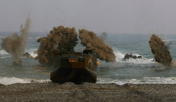 資料圖:韓國海軍陸戰(zhàn)隊(duì)兩棲戰(zhàn)車搶灘登陸演練