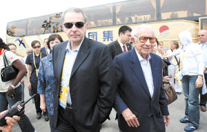 昨日,國(guó)際奧委會(huì)主席羅格(左)、榮譽(yù)主席薩馬蘭奇參觀奧運(yùn)村
