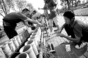 昨日(23日),朝陽公園的“炮管”正在安裝電子引線。本報(bào)記者趙亢攝