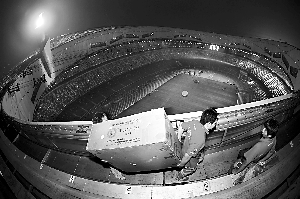 8月22日凌晨3時(shí),鳥巢頂正在安放閉幕式煙花,這是工作人員正在搬運(yùn)煙花。本報(bào)記者 陳杰 攝