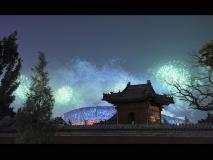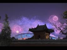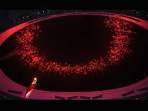 在第二章《記憶》中,三名運(yùn)動員站在登機(jī)舷梯上升至半空,他們抬頭仰望圣火。隨著一位運(yùn)動換緩緩打開手中的畫卷,鳥巢的環(huán)形大屏幕上出現(xiàn)了一幕幕賽場情景。伴著童聲合唱本屆奧運(yùn)會主題曲,火炬隨運(yùn)動員手中緩緩合攏的畫卷一起熄滅。由12層人墻組成的記憶之塔宛如再次燃?xì)獾男苄苁セ穑丶既藛T在高塔上呈現(xiàn)出牡丹花開的美麗畫面。16條祥云紗向北京的上空伸展。