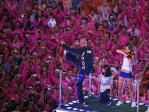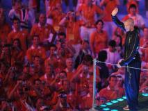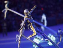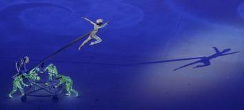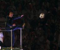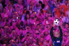 奧林匹克旗交接儀式后,全場燈光關(guān)閉,動畫色彩的倫敦的45秒宣傳片開始播放。紅色倫敦標(biāo)志性的雙層巴士緩緩進(jìn)入鳥巢,幾十名舞者化身等大巴車的乘客表演各式舞蹈。一個小女孩從大巴車中走出來,她接過足球后,踩著每個舞者的后背再次進(jìn)入雙層巴士,此時巴士瞬時變成了絢麗的舞臺。歌手利昂娜-劉易斯從舞臺上升起,英國搖滾樂隊“齊柏林飛船”的主音吉他手吉米-佩齊為他伴奏。在歌曲的尾聲,足球明星貝克漢姆與手持足球的小女孩一起出現(xiàn)在舞臺上,全場和歡呼聲口哨聲陣陣。他一腳任意球大力一射,將倫敦的邀請送達(dá)人群中。