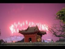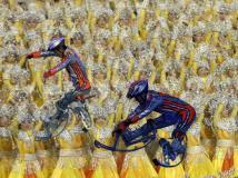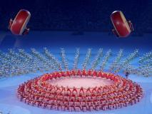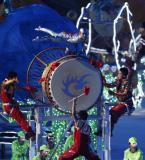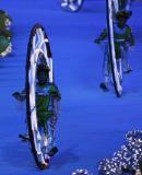 閉幕式開場時的倒計時,仍用煙花“畫”出數(shù)字符號,鳥巢一周拉手花束炸開一個滾動的、火紅的圓圈,代表最后一個數(shù)字“0”。200人威風(fēng)鼓表演拉開閉幕式序幕。《相聚》章節(jié)中,上千名身著紅金服裝的演員雙手揮舞鼓槌組成鼓的陣型,空中飛舞起兩面巨大的鼓面,兩名鼓手吊威亞擊鼓。從場地四周涌入的千名身著金色裙子和銀飾的少數(shù)民族姑娘舞動間銀鈴聲聲,霎時間鼓聲、吼聲、銀鈴聲響成一片。此時,鳥巢內(nèi)進(jìn)入了8輛鼓車,鼓車的造型各不相同,鼓手以各種不同方式敲擊著鼓。鼓樂節(jié)奏歡快喜慶,鼓車、鼓陣、舞者不停的變換著方陣的造型,最終舞者排列成整齊的通道,60輛飛輪在“通道”中進(jìn)入場地。來自少林寺塔溝武校的350位“少林小子”借助器械表演“彈龍?zhí)薄?地面變成了祥云的圖案。