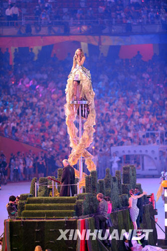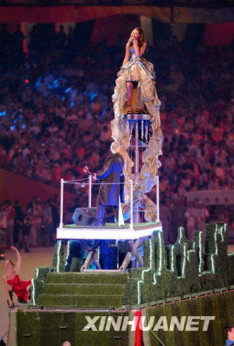8月24日晚,第29屆夏季奧林匹克運(yùn)動(dòng)會(huì)閉幕式在北京國(guó)家體育場(chǎng)——“鳥巢”舉行。這是歌手利昂娜·劉易斯(上)在倫敦巴士上演唱。新華社記者楊磊攝