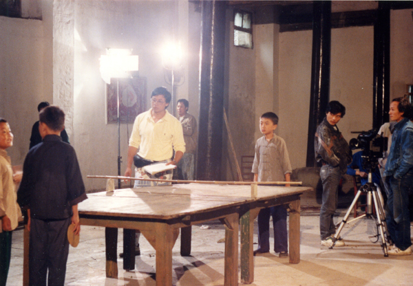 來到了最后面的大禮堂,那時(shí)已變了樣,都是忙碌的人。燈光雪亮,完全是舊時(shí)的模樣,也不知道他們是在哪里找到的那么破的乒乓臺(tái).開拍有人一聲叫,大家就各就各位了.也有人看了看我.心想這人是那里來的吧,我可是有點(diǎn)怕,有人問起我,我該如何回答。還好沒人來理我.我連忙拿出相機(jī),支好三腳架開始拍了起來。為了不影響攝制組的拍攝,我沒用閃光燈.用光圈F4,速度1/30秒拍了幾張。