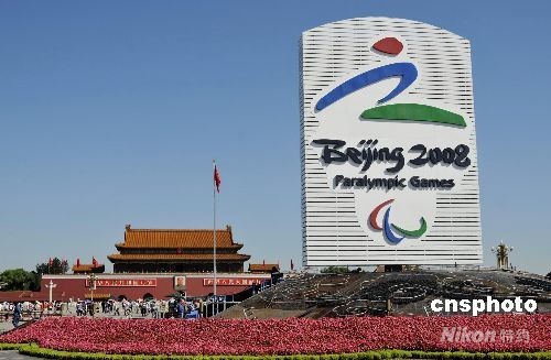 9月1日,北京2008年殘奧會會徽“天地人”屹立在北京天安門廣場。會徽以天、地、人和諧統(tǒng)一為主線,把中國的文字、書法和殘疾人奧林匹克運動精神融為一體,集中體現(xiàn)“心智、身體、精神”和諧統(tǒng)一的殘疾人奧林匹克運動精神,具有深厚的中國傳統(tǒng)文化底蘊。殘奧會開閉幕式將分別于9月6日和17日晚8點在北京的國家體育場“鳥巢”舉行。中新社發(fā)王宇婷 攝