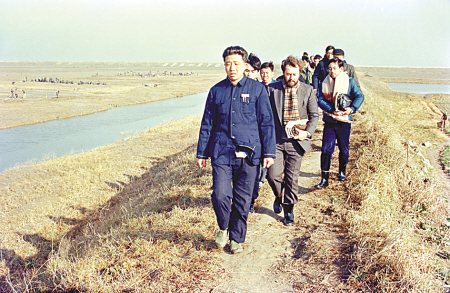 圖為1983年世界糧食計劃署官員羅伯特先生視察聯(lián)合國援建的慈溪四灶浦萬畝魚塘工地。(俞丹樺 攝)