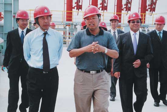 2005年6月8日,時(shí)任中信集團(tuán)公司總經(jīng)理、現(xiàn)任董事長(zhǎng)孔丹(左二),中信集團(tuán)公司副總經(jīng)理王炯(右二)考察寧波萬(wàn)華工業(yè)園。