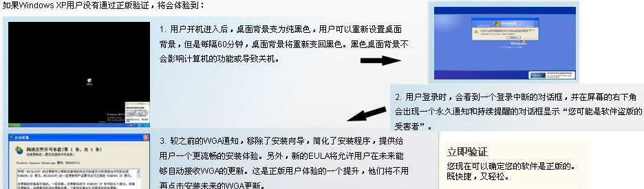 ——Windows正版增值計劃通知(簡稱WGA)和Office正版增值計劃通知(簡稱OGA)。屆時,盜版XP專業(yè)版用戶的桌面背景每隔1小時將被成純黑色,盜版Office用戶軟件上將被永久添加視覺標(biāo)記。國內(nèi)用戶對微軟“黑屏”的做法反應(yīng)劇烈。