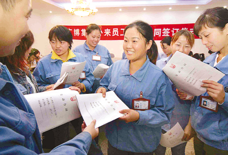 浙江廣博集團(tuán)有限公司外來員工在簽訂勞動合同時,高興得合不攏嘴——企業(yè)已把外來員工免費(fèi)享受五大保險的內(nèi)容寫進(jìn)了合同。(胡建華 攝)