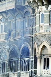 11月29日,消防人員在印度孟買泰姬瑪哈酒店外滅火。(新華社記者呂小煒攝)