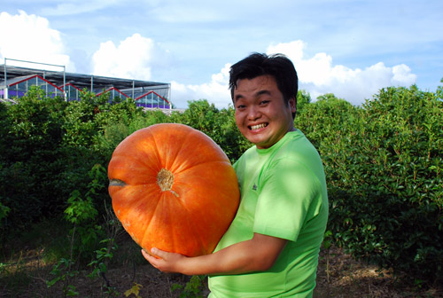 圖片說明:懷抱碩大的南瓜,采訪團的記者驚喜不已。