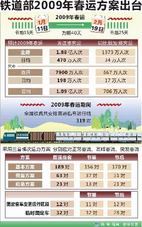 2009年全國(guó)鐵路春運(yùn)方案出臺(tái),鐵道部新聞發(fā)言人王勇平昨日發(fā)布,2009年春運(yùn)自1月11日起至2月19日止,為期40天,其中,節(jié)前15天,節(jié)后25天。