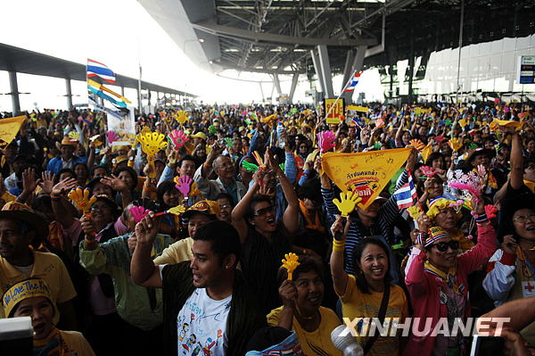 12月3日,泰國反政府的人民民主聯盟(民盟)支持者在曼谷素萬那普國際機場載歌載舞。當天,民盟結束對總理府和曼谷兩座機場的占領,宣稱推翻頌猜政府的目的已經達到,所有反政府集會全部停止。新華社記者凌朔攝