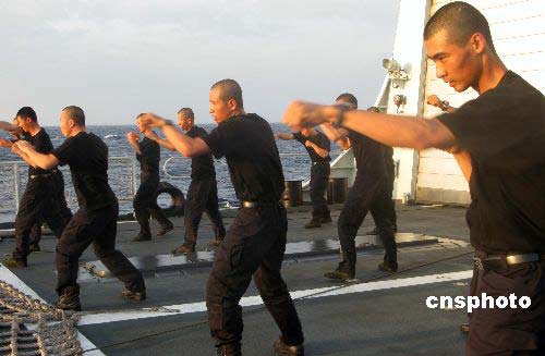 記者拍了幾幅特戰(zhàn)隊(duì)員晨練照片,自己也搖晃著繞著甲板慢跑了幾圈,等特戰(zhàn)隊(duì)員晨練結(jié)束,便走過(guò)去與隨艦特戰(zhàn)隊(duì)員的負(fù)責(zé)人攀談起來(lái)。他說(shuō),艦上受條件所限,特戰(zhàn)隊(duì)員們岸上平常每日都要進(jìn)行的長(zhǎng)跑等體能訓(xùn)練沒(méi)法展開(kāi),在艦上一般進(jìn)行搏擊、擒拿、格斗等訓(xùn)練,目標(biāo)是執(zhí)行任務(wù)時(shí)能在第一時(shí)間克敵制勝。