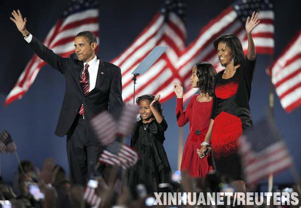 2008年11月4日,在美國芝加哥格蘭特公園,美國民主黨總統(tǒng)候選人奧巴馬(左一)與家人在選舉夜活動現(xiàn)場向支持者揮手致意。美國各大電視網(wǎng)公布的初步統(tǒng)計結(jié)果顯示,奧巴馬在當(dāng)日舉行的總統(tǒng)選舉中擊敗共和黨對手約翰·麥凱恩,當(dāng)選第56屆美國總統(tǒng)。他將成為美國歷史上首位非洲裔總統(tǒng)。 新華社/路透