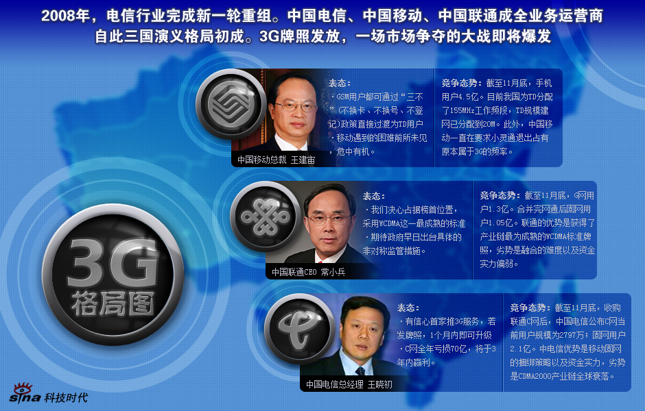 我國(guó)三大運(yùn)營(yíng)商3G前夜態(tài)勢(shì)則可簡(jiǎn)單概括為:中國(guó)移動(dòng)有頻率、有業(yè)務(wù)牌照;中國(guó)電信有頻率、無(wú)業(yè)務(wù)牌照;而中國(guó)聯(lián)通則為無(wú)頻率、無(wú)業(yè)務(wù)牌照。