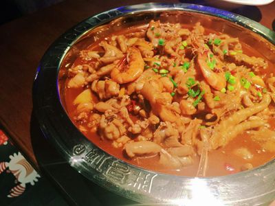 胖哥家的牛蛙煲味厚量多。∨M苋赓|(zhì)鮮嫩,筋骨齊全(換句話講就是分量多啦,不是用什么邊角料來湊數(shù)的),配料雞爪是吃不完的節(jié)奏,但不會(huì)吃膩,入口去骨、軟糯留香說的就是這種境界。配菜土豆、冬瓜也是入味十足的,難得吃燉制的土豆沒有生澀味,該贊一個(gè)。