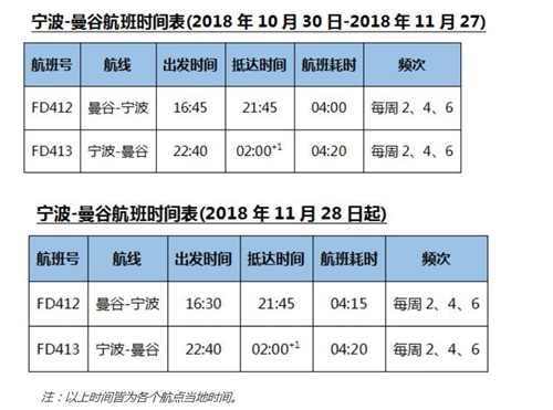 10月30日-11月27期間,曼谷-寧波的航班號是FD412,16:45出發(fā),21:45抵達,耗時4小時;寧波-曼谷的航班號是FD413,22:40出發(fā),02:00+1抵達,飛行時長4小時20分;從11月28日起,曼谷直飛寧波的航班時間略有調(diào)整,航班號FD412曼谷-寧波從16:30出發(fā),21:45寧波,耗時4小時15分鐘,而寧波直飛曼谷不變。