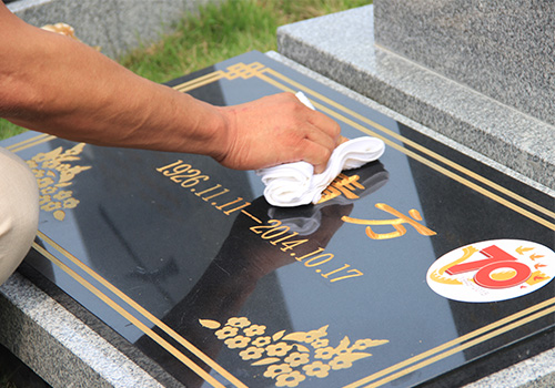圖為老兵家屬擦墓碑