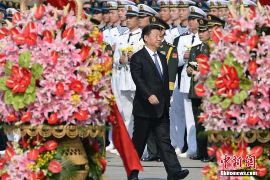 9月30日,烈士紀(jì)念日,向人民英雄敬獻(xiàn)花籃儀式在北京天安門廣場(chǎng)人民英雄紀(jì)念碑前舉行,習(xí)近平等黨和國(guó)家領(lǐng)導(dǎo)人出席儀式。 中新社記者 廖攀 攝